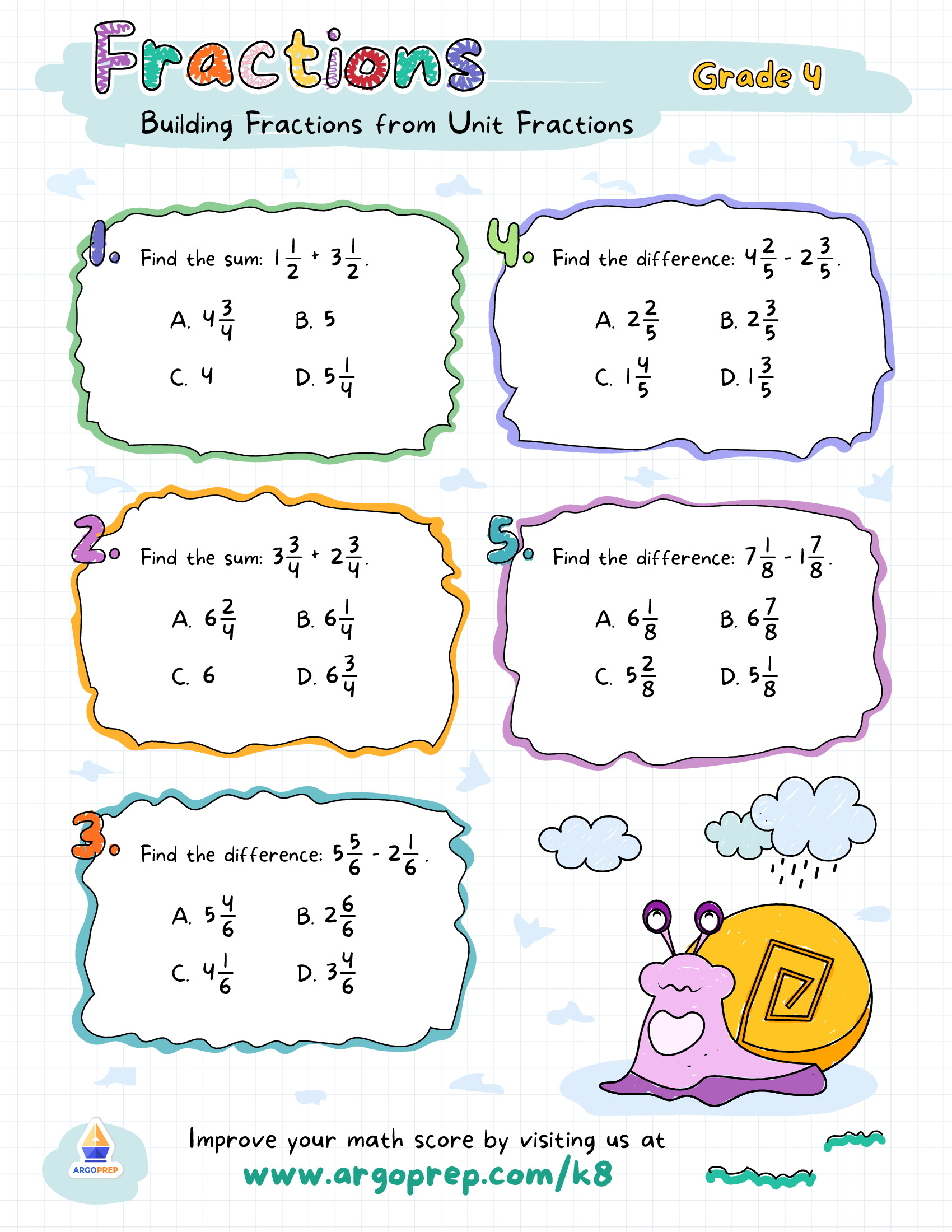 Decompose a fraction into a sum of fractions with the same denominator in more than one way, recording each decomposition by . This quiz/worksheet set lets you find out how much you know about decomposing fractions. Help prepare them for the 5th grade fractions standards. A unit fraction is a fraction in which numerator is 1. Examples provided on the worksheet.